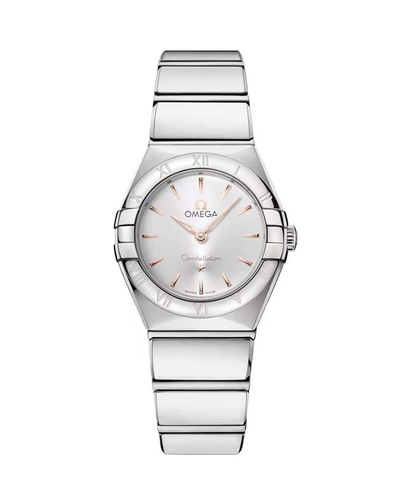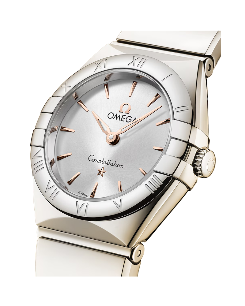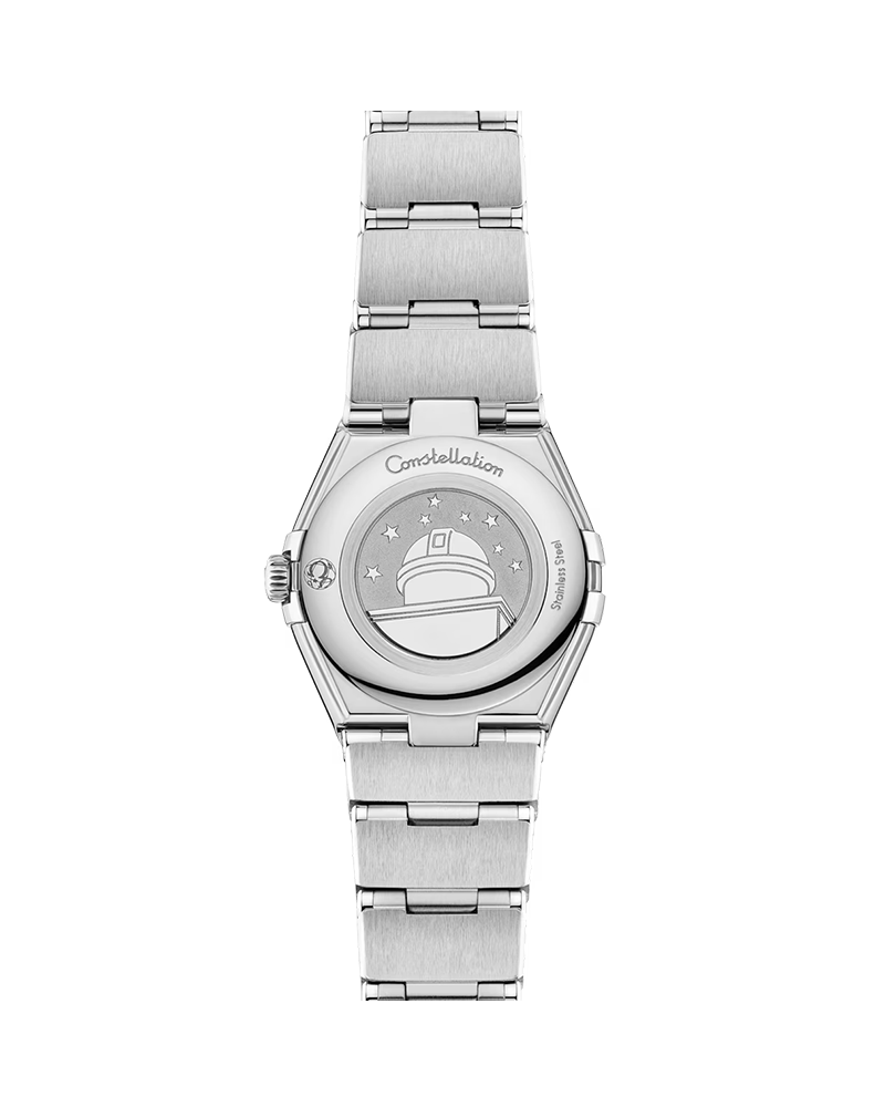 With precision inspired by the stars, the iconic OMEGA Constellation is characterised by its famous case with half-moon facets, and the polished claws that grip to the sides. This 25 mm model is crafted in polished stainless steel and features a polished bezel with Roman numerals engraved. The sun-brushed silvery white dial creates an elegant backdrop, while other details include polished and skeletonized 18K Sedna™ Gold hands and star at six o’clock, and hour markers in polished 18K Sedna™ Gold. The watch is presented on a signature polished mono-rang bracelet with easy comfort-adjustment, and is powered by the OMEGA Calibre 4061, which sits behind a stamped Constellation Observatory medallion on the caseback.