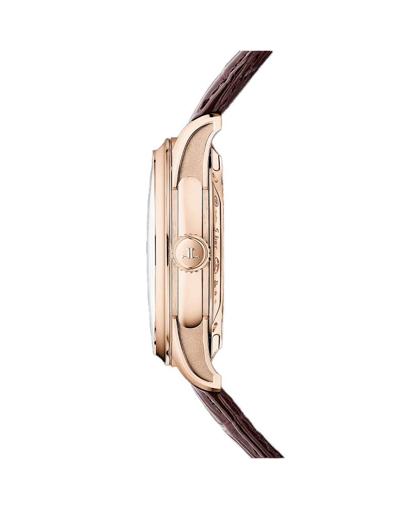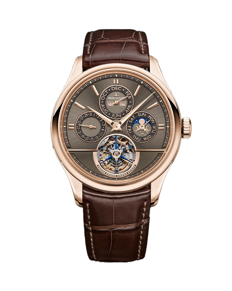 In its pink gold version, the Master Grande Tradition watch showcases its complications on a soft brown sunray dial: tourbillon and cylindrical balance spring, perpetual calendar and three counters, including a moon phase with Night & Day indicator. This exceptional timepiece reveals incredible levels of precision and complexity. In addition to the case featuring more than 80 components and boasting a triple polished, brushed and beveled finish, the Calibre 985 designed, assembled and decorated at our Maison is one of our most complex. Endowed with 83 components, the tourbillon weighs less than 0.4 grams. Another horological feat is the two-level dial with its different finishes, which imbues the brown color contrast and relief.