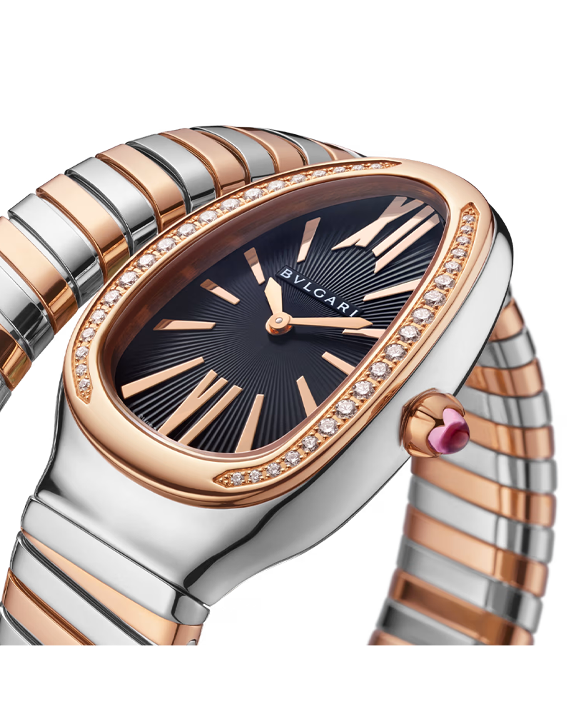 Merging two of the most iconic symbols of Bulgari design, the Serpenti Tubogas watch coils the sinuosity of the snake with the contemporary soul of tubogas. Evoking both the sensual curves of a woman and the fluid shape of the serpent, the timepiece is crafted with the shapely lines of this specific technique, with a flexible and tubular litheness. Radiating glamour and a truly individual style, this watch marks a distinctive chapter in the constant evolution of Serpenti. Serpenti Tubogas watch with quartz movement, 35 mm stainless steel curved case, 18 kt rose gold bezel set with brilliant cut diamonds, 18 kt rose gold crown set with a cabochon cut pink rubellite, black opaline dial with guilloché soleil treatment and hand-applied indexes, single spiral 18 kt rose gold and stainless steel bracelet.