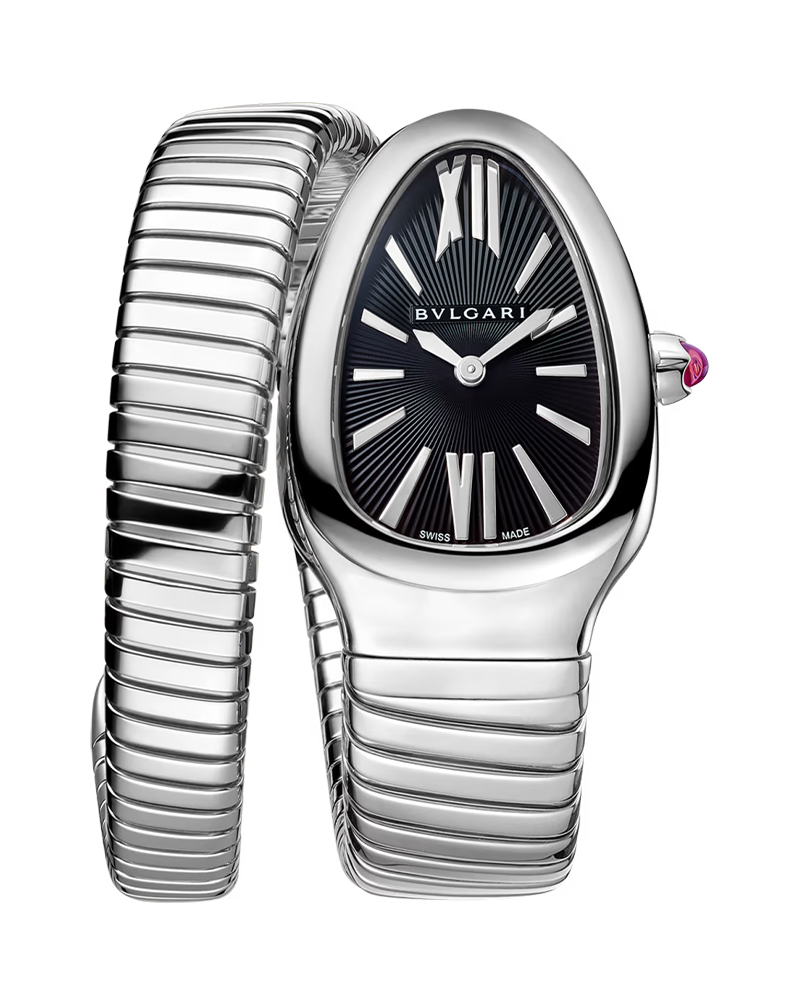 Merging two of the most iconic symbols of Bulgari design, the Serpenti Tubogas watch coils the sinuosity of the snake with the contemporary soul of tubogas. Evoking both the sensual curves of a woman and the fluid shape of the serpent, the timepiece is crafted with the shapely lines of this specific technique, with a flexible and tubular litheness. Radiating glamour and a truly individual style, this watch marks a distinctive chapter in the constant evolution of Serpenti. Serpenti Tubogas watch with quartz movement, 35 mm stainless steel curved case, stainless steel crown set with a cabochon cut pink rubellite, black opaline dial with guilloché soleil treatment, single spiral stainless steel bracelet.
