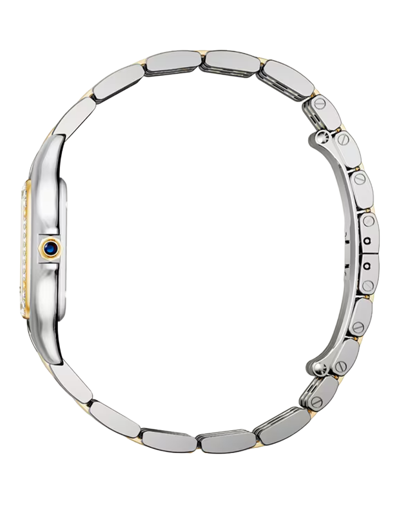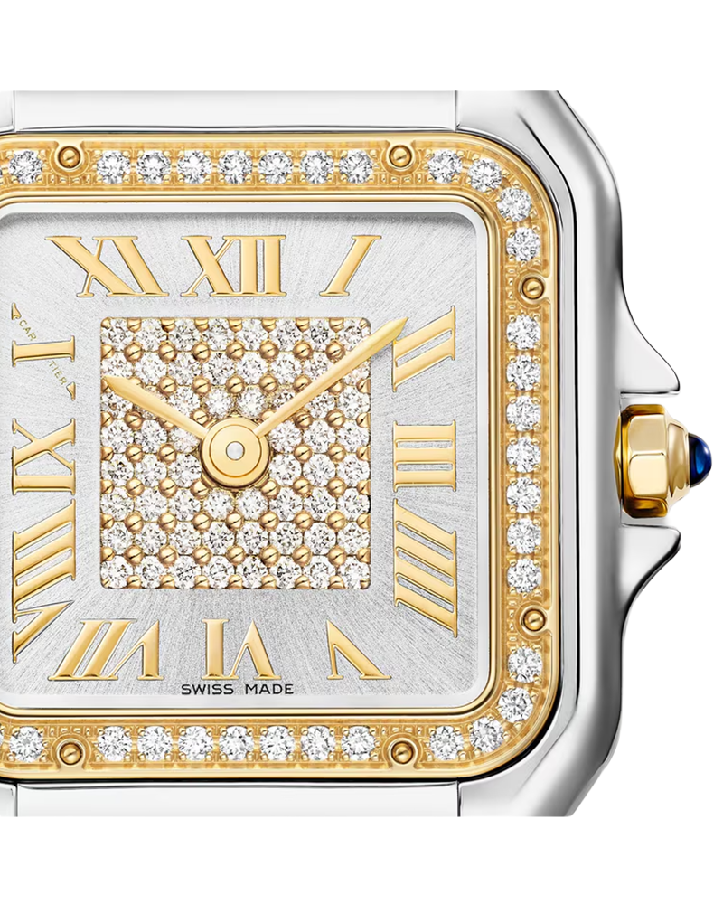 Designed in the 1980s, the Panthère de Cartier watch takes its name from the bracelet of the same name. Its ultra-flexible structure echoes the movements of the Maison’s emblematic animal. Both a watch and a piece of jewelry, it is a veritable fashion icon for women with bold style. Panthère de Cartier watch, medium model, quartz movement. 18K yellow gold (750/1000) and steel case set with 44 brilliant-cut diamonds totaling 0.28 carats. Dimensions: 36.5 mm x 26.7 mm. Thickness: 6.8 mm. 18K yellow gold (750/1000) octagonal crown adorned with a blue synthetic spinel. Silvered sunray-brushed dial set with 60 brilliant-cut diamonds totaling 0.23 carats, golden-finish sword-shaped hands. 18K yellow gold (750/1000) and steel bracelet. Water-resistant up to 3 bar (approx. 30 meters).