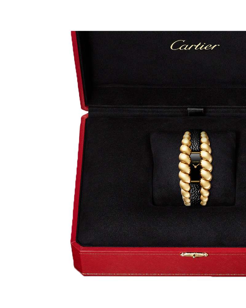 Like a magician, Cartier transforms materials and shapes to bring forth an unexpected beauty. With the Tressage watch, gold, diamonds, and stones are transformed by an alchemy characteristic of Cartier. As creative as it is precious, the Tressage watch follows in the footsteps of Cartier’s Maillon, Coussin and Reflection watches. Yellow gold, distinctive volumes, and contrasting materials: this timepiece reinterprets these elements, drawn from the Maison’s vocabulary, combining and opposing them to create a true watchmaking sculpture. On this watch, two twists of gold and diamonds surround a rectangular dial paved with snow-set diamonds. On one side, the smooth roundness of yellow gold alternates with pavé diamonds, while on the other, the bold, sharp lines of vertical brancards provide contrast. The shiny leather strap continues this interplay of materials.