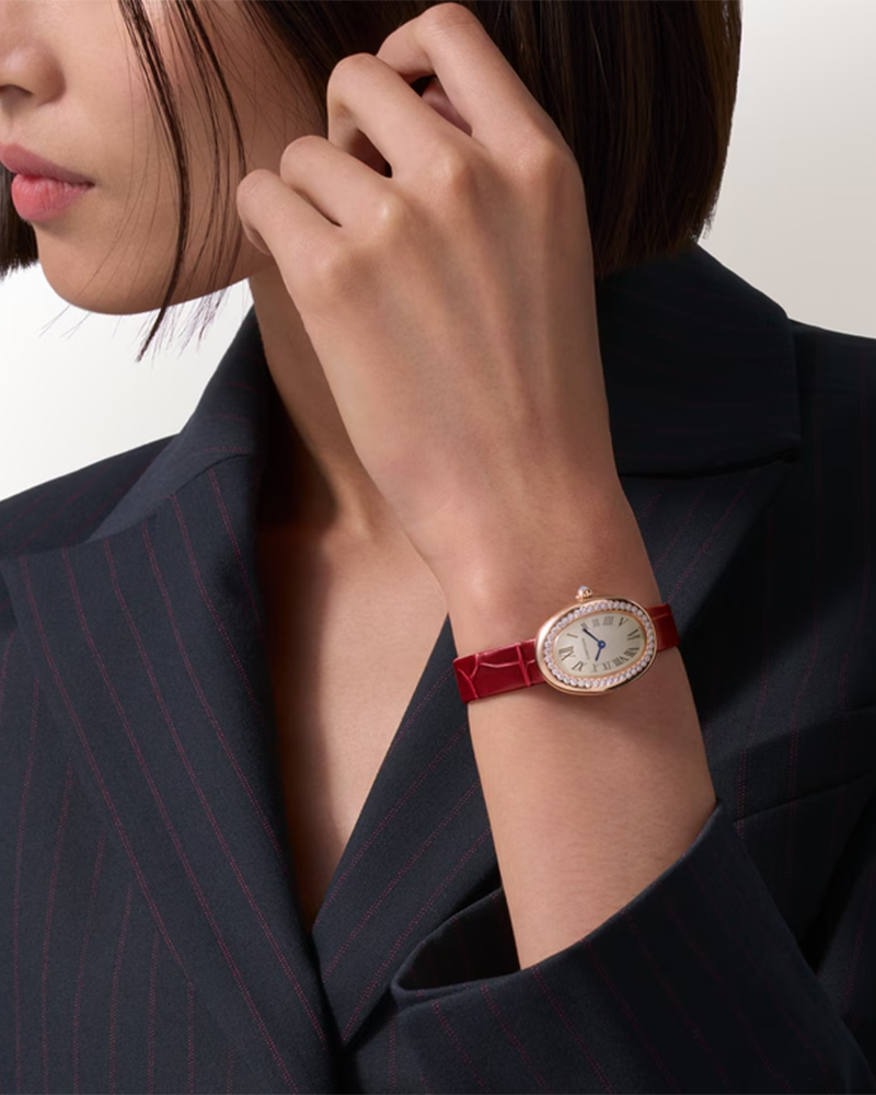 Baignoire de Cartier watch, small model, quartz movement. 18K rose gold (750/1000) case set with 42 brilliant-cut diamonds totaling 0.48 carats. Rose gold 750/1000 beaded crown set with a diamond cabochon totaling 0.08 carats. Silvered dial, blued-steel sword-shaped hands, sapphire crystal. Varnished red alligator-skin strap, rose gold 750/1000 ardillon buckle. Length: 31.4 mm, width: 23.09 mm, thickness: 6.95 mm. Water-resistant up to 3 bar (approx. 30 meters).