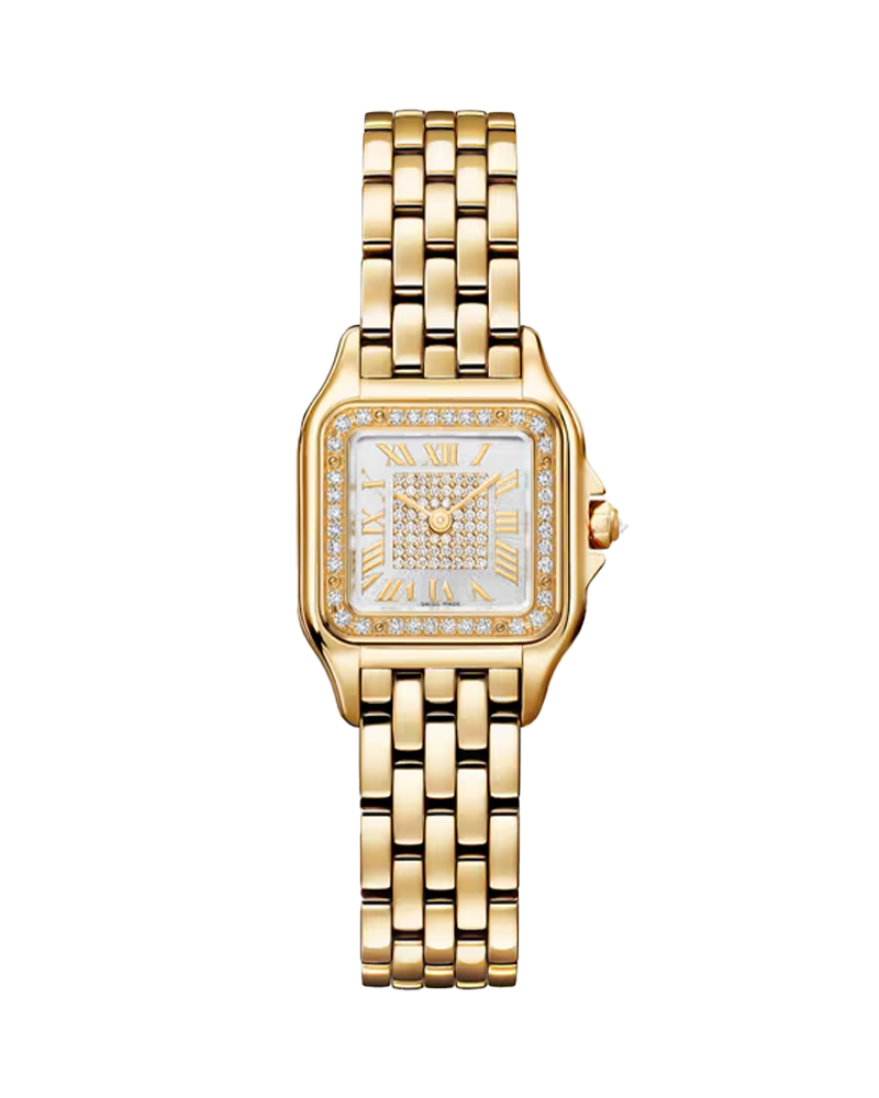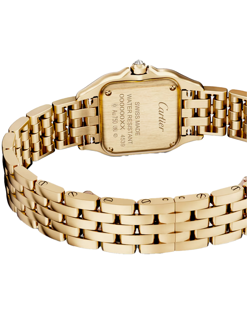 Designed in the 1980s, the Panthère de Cartier watch takes its name from the bracelet of the same name. Its ultra-flexible structure echoes the movements of the Maison’s emblematic animal. Both a watch and a piece of jewelry, it is a veritable fashion icon for women with bold style. Panthère de Cartier watch, small model, quartz movement. 18K yellow gold (750/1000) case set with 36 brilliant-cut diamonds totaling 0.23 carats. Dimensions: 30.3 mm x 22 mm, thickness: 6.3 mm. 18K yellow gold (750/1000) octagonal crown set with a brilliant-cut diamond totaling 0.02 carats. Silvered sunray-brushed dial set with 60 brilliant-cut diamonds totaling 0.12 carats, golden-finish sword-shaped hands. 18K yellow gold (750/1000) bracelet. Water-resistant up to 3 bar (approx. 30 meters/100 feet).