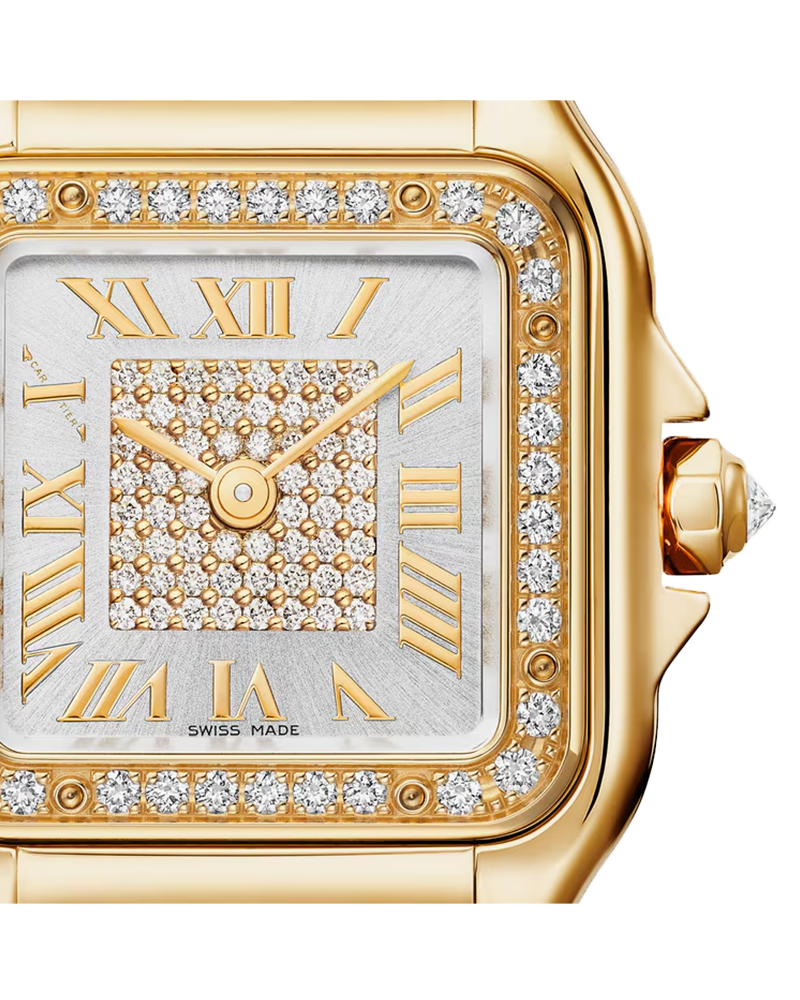 Panthère de Cartier watch, small model, quartz movement. 18K yellow gold (750/1000) case set with 36 brilliant-cut diamonds totaling 0.23 carats. Dimensions: 30.3 mm x 22 mm, thickness: 6.3 mm. 18K yellow gold (750/1000) octagonal crown set with a brilliant-cut diamond totaling 0.02 carats. Silvered sunray-brushed dial set with 60 brilliant-cut diamonds totaling 0.12 carats, golden-finish sword-shaped hands. 18K yellow gold (750/1000) bracelet. Water-resistant up to 3 bar (approx. 30 meters/100 feet).