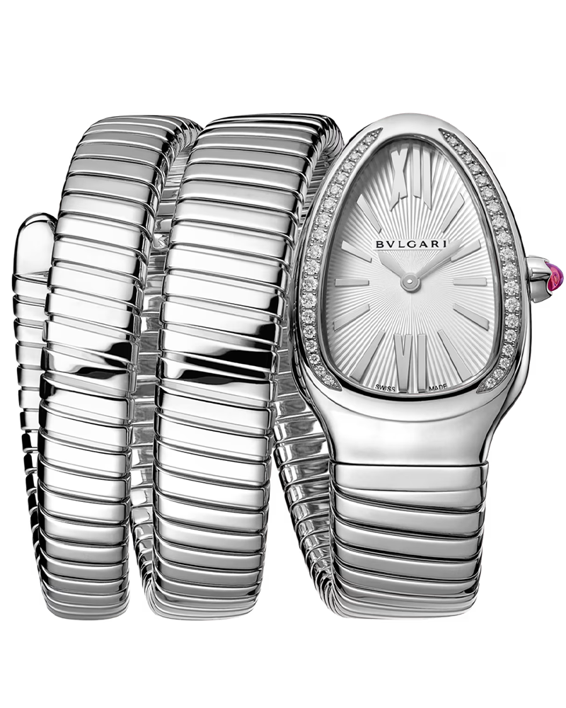 Merging two of the most iconic symbols of Bvlgari design, the Serpenti Tubogas watch coils the sinuosity of the snake with the contemporary soul of tubogas. Evoking both the sensual curves of a woman and the fluid shape of the serpent, the timepiece is crafted with the shapely lines of this specific technique, with a flexible and tubular litheness. Radiating glamour and a truly individual style, this watch marks a distinctive chapter in the constant evolution of Serpenti. Serpenti Tubogas watch with quartz movement, 35 mm stainless steel curved case set with brilliant cut diamonds, stainless steel crown set with a cabochon cut pink rubellite, silver opaline dial with guilloché soleil treatment and hand-applied indexes, double spiral stainless steel bracelet.