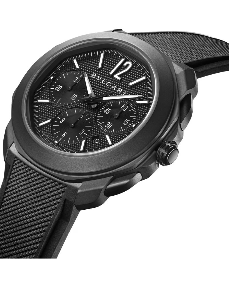 With its appealing round-but-not-round octagonal case, the Octo Roma automatic watch in sandblasted stainless steel with black DLC treatment is an emblem of contemporary style, blending Roman inspiration with Italian design and Swiss watchmaking expertise. Integrating an Haute Horlogerie motif at the heart of its distinctive aesthetic, the timepiece features a Clous de Paris finish on the matte black dial, accentuated by Super-LumiNova® hands and hour markers for optimum legibility and a striking visual effect. Powered by an automatic movement with chronograph, the watch comes with an interchangeable black rubber strap and an additional black alligator bracelet.