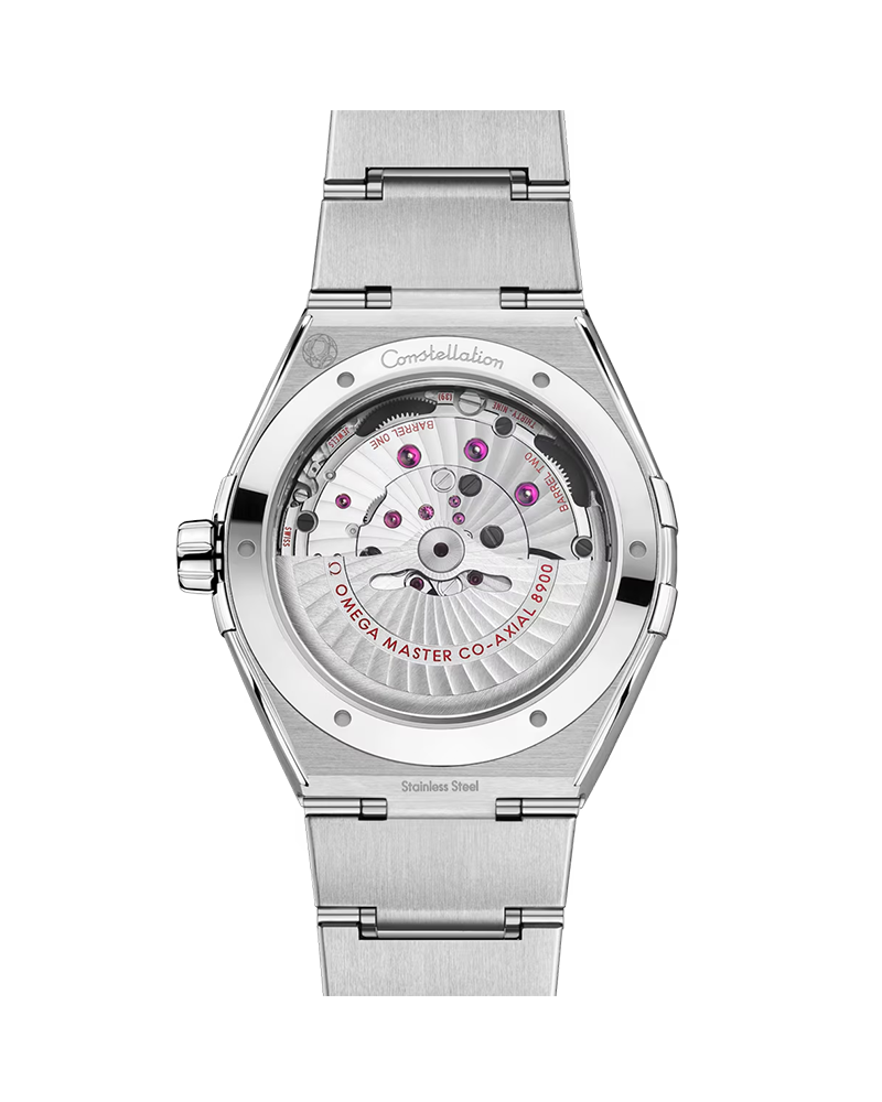 Presented on a stainless-steel bracelet, this timepiece is driven by the OMEGA Co-Axial Master Chronometer Calibre 8900, visible through the domed scratch-resistant sapphire crystal.