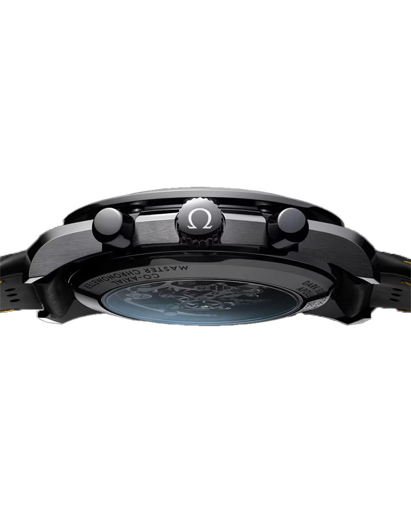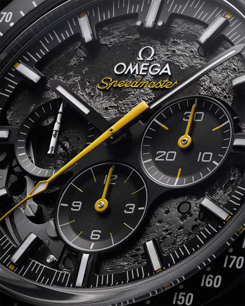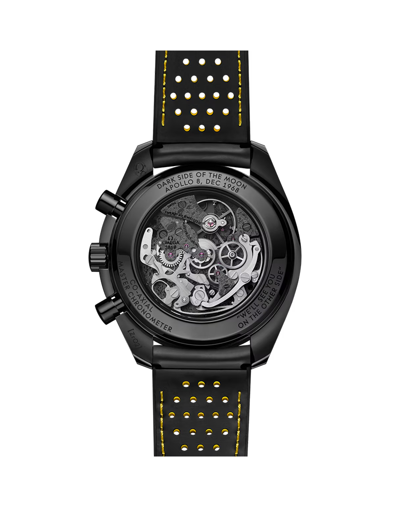 As a part of all six moon landings in history, the legendary OMEGA Speedmaster is a true icon of space as well as OMEGA’s pioneering spirit. In this 44.25 mm model, the Speedmaster’s history aboard the Apollo 8 mission is celebrated through the blackened movement, which is laser-ablated on the main plate and bridges to represent the moon’s surface. The near side can be seen through the skeletonized black anodised aluminium dial, while the far side can be seen through the caseback. Presented on a perforated black rubber strap with yellow rubber interior, the entire watch is black ceramic and includes a varnished yellow chronograph seconds hands and a laser-engraved tachymeter scale on the bezel which is filled with white enamel. The small-seconds subdial (patent pending) also includes a grade 5 titanium hand shaped like the Saturn V rocket. This 3D shape is obtained by laser turning, while the colours are obtained by white varnish, ablation, and laser blackening. The specially decorated movement is the OMEGA Co-Axial Master Chronometer Calibre 3869, while the engravings on the caseback include “APOLLO 8, DEC 1968”, “DARK SIDE OF THE MOON”, “WE’LL SEE YOU ON THE OTHER SIDE”, and ""CO-AXIAL MASTER CHRONOMETER.