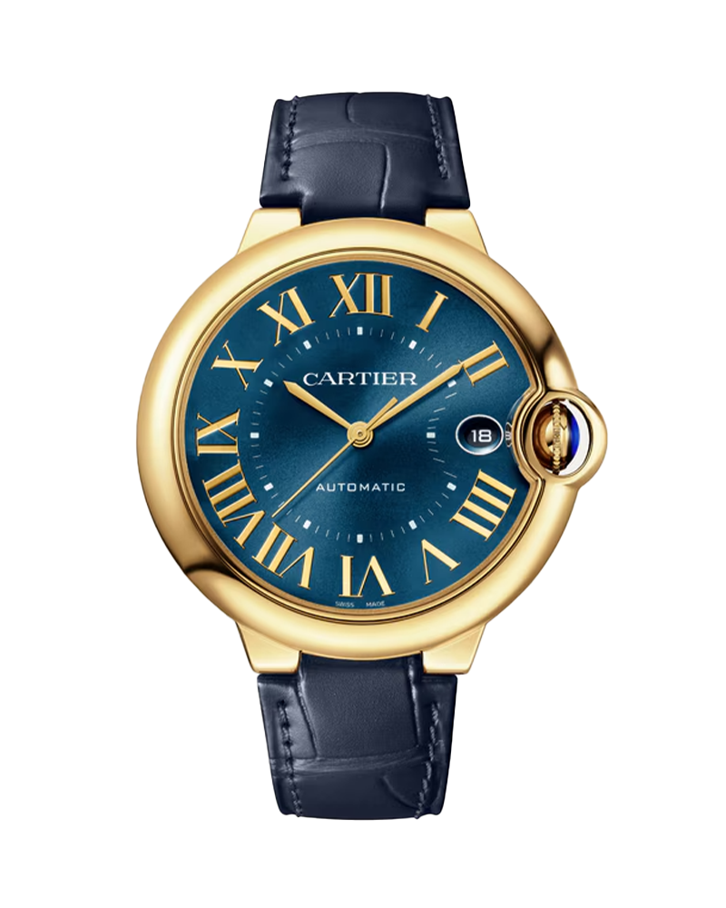 Ballon Bleu de Cartier watch, 40 mm, mechanical movement with automatic winding, caliber 1847 MC. 18K yellow gold (750/1000) case, fluted 18K yellow gold (750/1000) crown set with a sapphire cabochon, blue sunray dial, golden-finish steel sword-shaped hands. Sapphire crystal. Interchangeable dark blue alligator leather strap, 18K yellow gold (750/1000) interchangeable folding clasp, calendar aperture at 3 o'clock. Thickness: 12.4 mm. Water-resistant up to 3 bar (approx. 30 meters/100 feet).